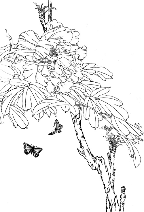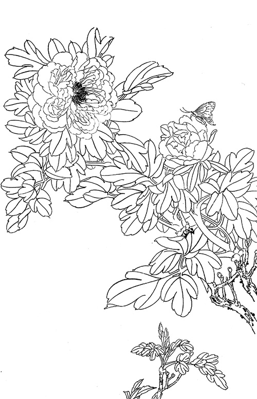 工笔白描牡丹