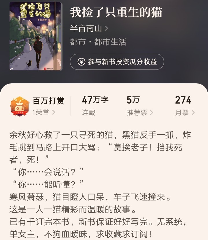 书评:一本不用担心太无聊的日常文,文风幽默搞笑,代入感极强。主要讲述了一只猫和一个男人的故事,主角余秋在一个夜晚捡到了一只重生的猫(前世是个男的),并惊奇的发现只有他可以听懂“猫”说的话。之后这只黑猫还写起了小说,嘿嘿,在小说中看猫写小说,不亦乐乎。