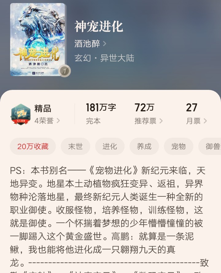 书评:一本御兽文,在这本书中可以看到千奇百怪的神兽,灰盘斑纹蛛、黑暴猿、魔鬼螳螂无一不让人震撼。是一本致敬宠魅、神奇宝贝、数码宝贝的神作。