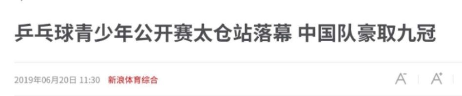 《乒乓球青少年公开赛太仓站落幕 中国队豪取九冠》新浪体育综合,2019年6月20日发布