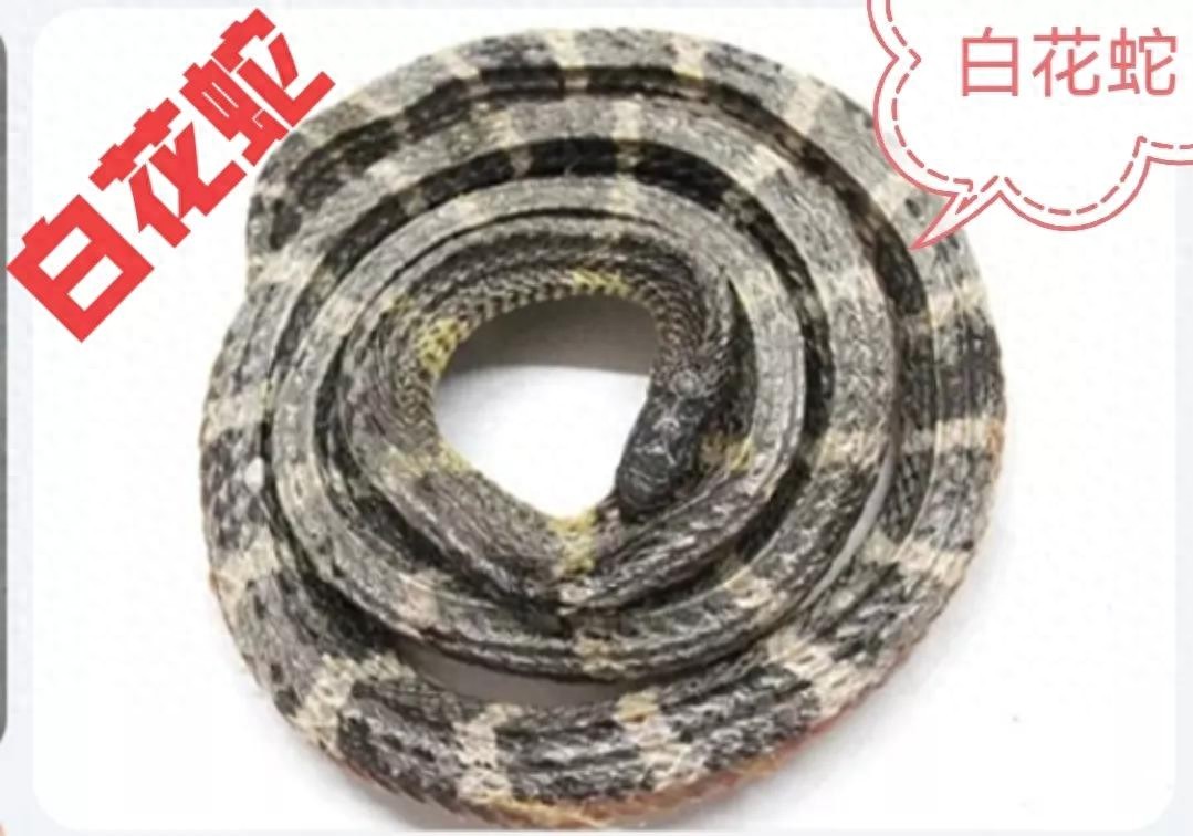 2、广白花蛇:系游蛇科百花锦蛇除去内脏的全体,又名花蛇。主产广西、广东等地。晒干,用酒润透,切段烘干生用。味甘、咸,性温。无毒。功效应用与蕲蛇相似。广西以白花锦蛇作白花蛇用,据广西壮族自治区药检所调查资料称使用时间已有百年之久。广东、湖北也有部分地区使用。