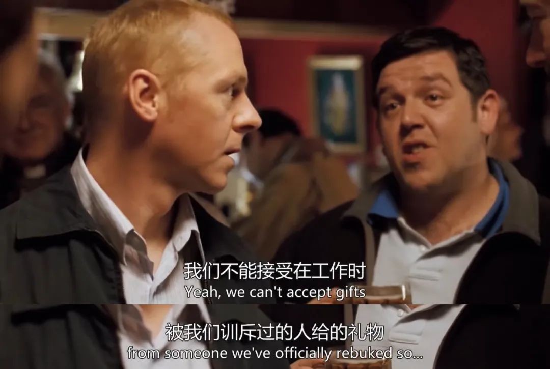 △Hot Fuzz (《热血警探》2007) 的国语配音版将这句台词译成"我们不接受被我们开过罚单的人的礼物",officially rebuke 字面为"正式谴责",与开罚单的书面惩罚形式一样,后者更显调侃语气,符合电影的恶搞风格。