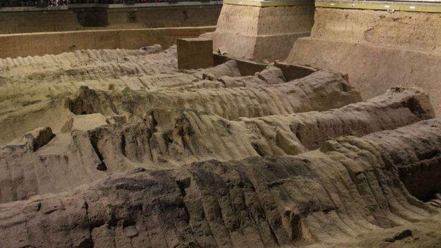 秦始皇兵马俑博物馆的二号坑在一号坑北侧,平面略呈曲尺形,1976年发现,位于一号坑北侧约20米处,是秦俑坑中的精华,二号坑的发现揭开了古代军阵之谜。
