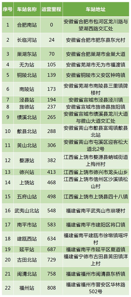 合福高速铁路全线设22个车站:合肥南站、长临河站、巢湖东站、无为站、铜陵北站、南陵站、泾县站、旌德站、绩溪北站、歙县北站、黄山北站、婺源站、德兴站、上饶站、五府山站、武夷山北站、南平市站、建瓯西站、延平站、古田北站、闽清北站、福州站。