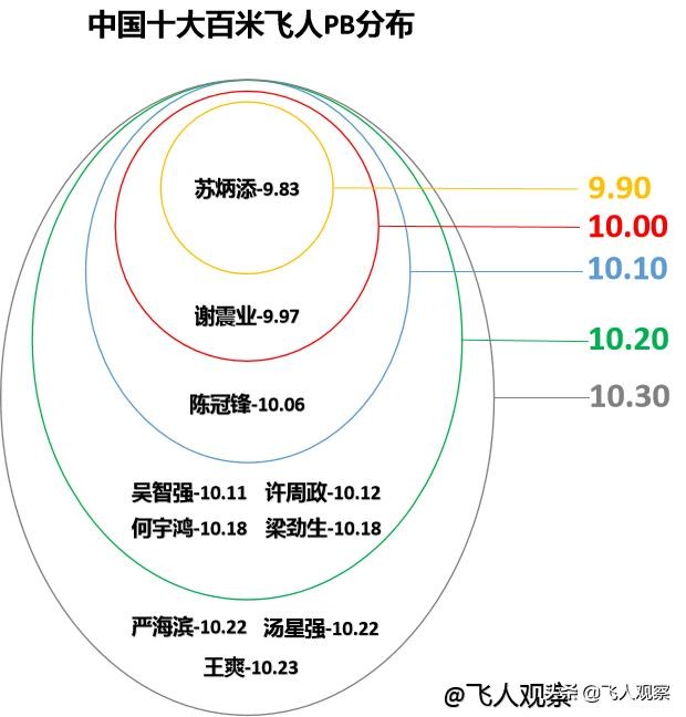 十大百米飞人的PB成绩分布,呈现出几个特征: