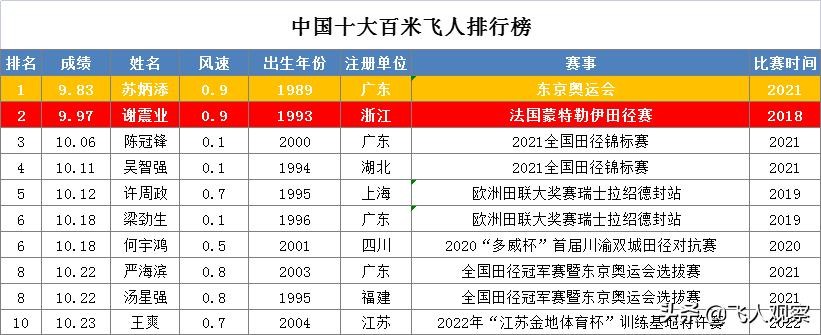 2022中国十大百米飞人排行榜,苏炳添9秒83傲视群雄