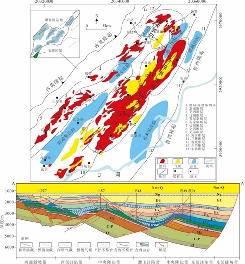 图2:东濮凹陷位置、剖面图,红色表示石油,黄色表示天然气(柯昌炜,2020)