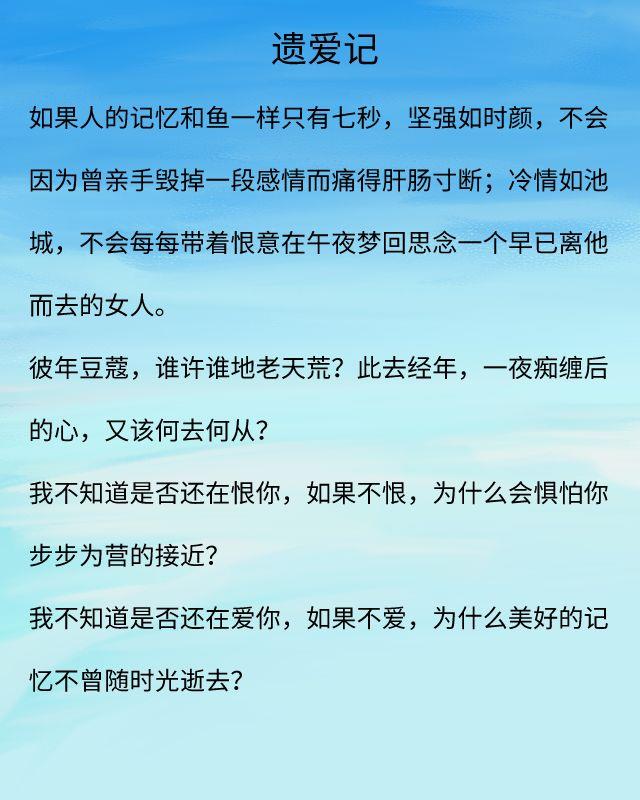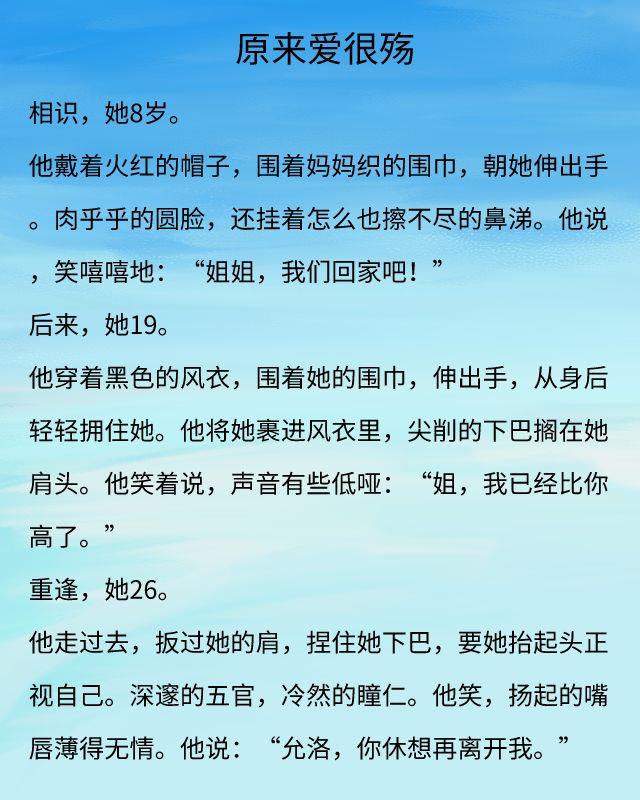 蓝白色的文笔富有镜头感,这篇文章里的描述自然让人感同身受。事实上,这是一个虐心的故事,女主很懂人心,明白能最大程度上伤害自己的人,必然是自己深爱的人。男主也是优秀,对女主有矛盾,但最终深爱战胜一切。
