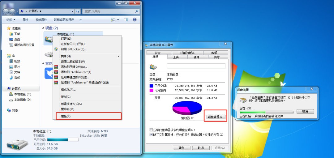 Windows 7/10系统:右键点击C盘,选择属性,在弹出界面下,选择磁盘清理。