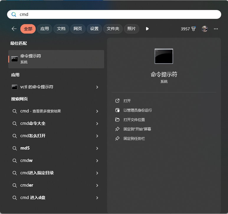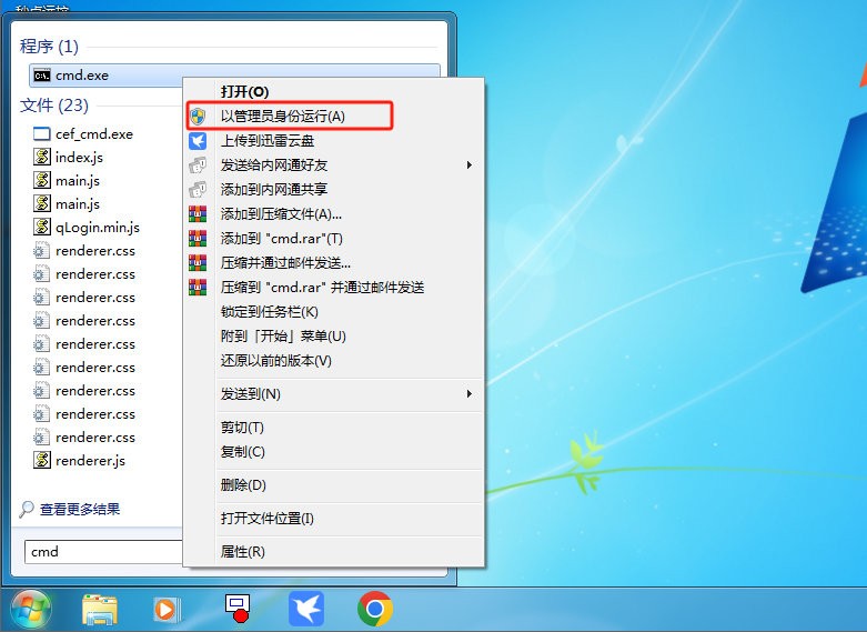 在搜索框中,输入“cmd”,Windows 7右键“以管理员身份运行”,Windows 10/11直接选择"以管理员身份运行"选项即可。