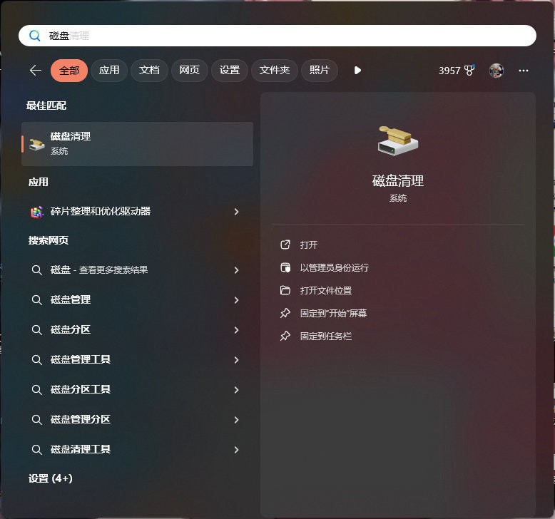 Windows 11可在搜索功能里直接搜索 磁盘清理 功能进行操作;
