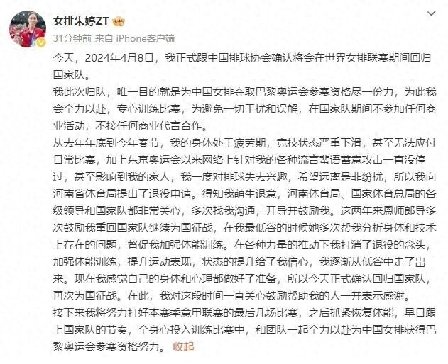 “为了国家队,我回来了。”朱婷在微博上的宣言简短而有力。她清楚地告诉世界,回归国家队的唯一目的是帮助中国女排赢得奥运资格。这不仅是对自己的挑战,更是对队伍的承诺。朱婷还宣布,在备战期间,她将远离所有商业干扰,全身心投入到训练和比赛中。这份职业态度与坚定的决心,让人不禁为之点赞。