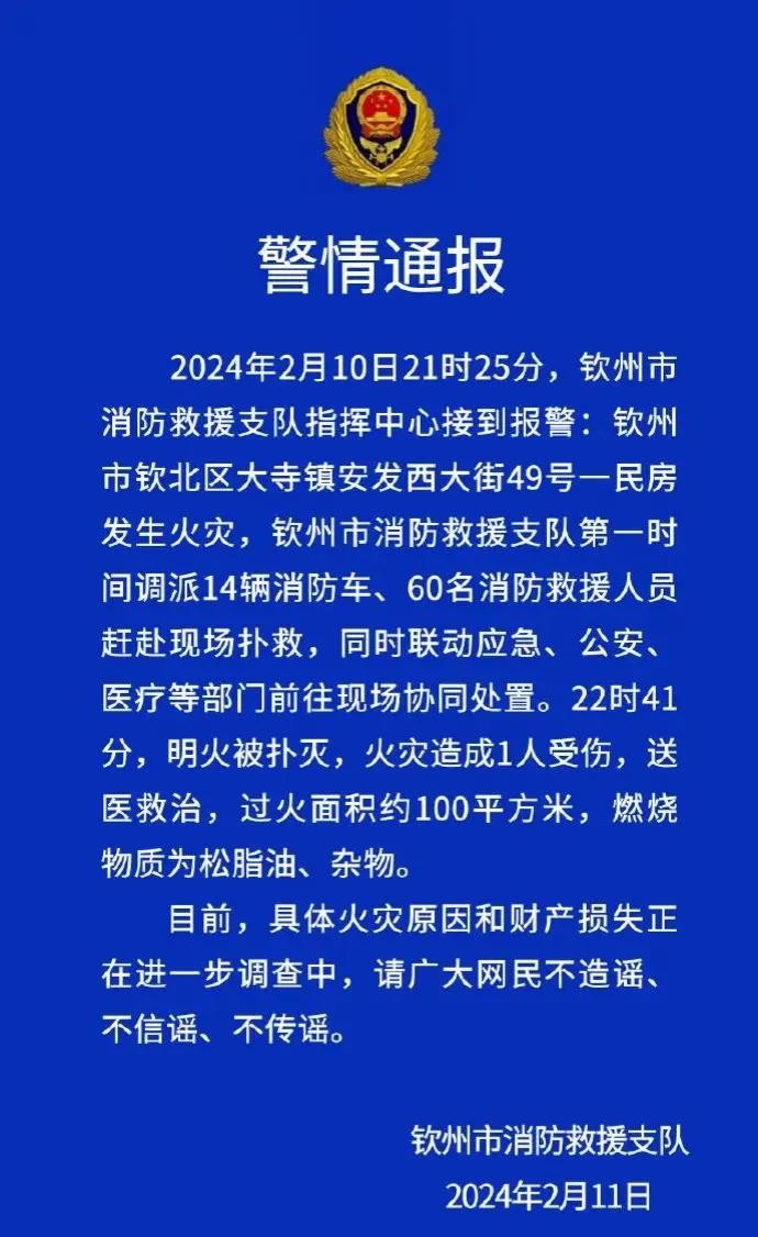 2024年2月10日晚,广西钦州市钦北区大寺镇安发西大街49号一民房突发火灾。火势凶猛,浓烟滚滚。钦州市消防救援支队接到报警后,迅速调派14辆消防车、60名消防救援人员赶赴现场。消防队员们冒着浓烟和烈火,紧张有序地进行灭火和救援工作。经过近一个小时的紧张扑救,22时41分,明火终于被扑灭。