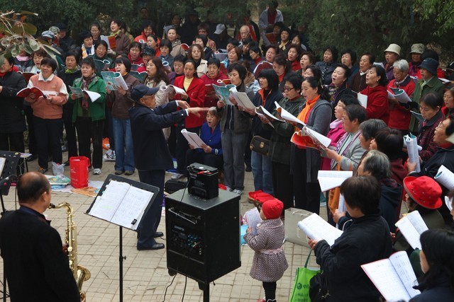 走到里面的一个角落,看到有群众自发组织的合唱团,据说是一个常驻节目,有乐器、指挥,人数有一百人左右,氛围浓厚,极具穿透力和感染力的歌声传遍公园。
