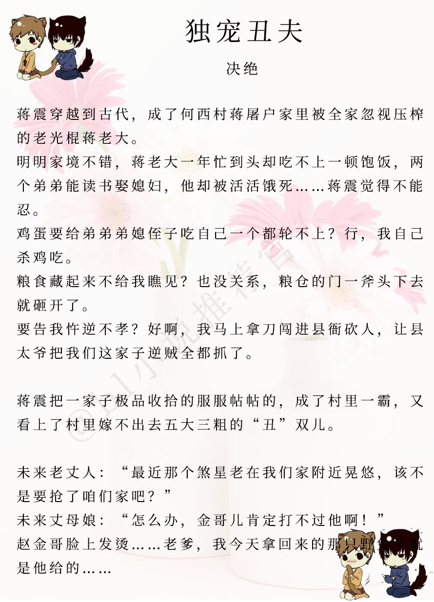 简评:巨能折腾攻vs乐观勤快结巴受。这是一个有男人、女人、双儿的架空世界。这是一个男主攻穿越到异世,种茶发家致富养他的冲喜小夫郎的故事。