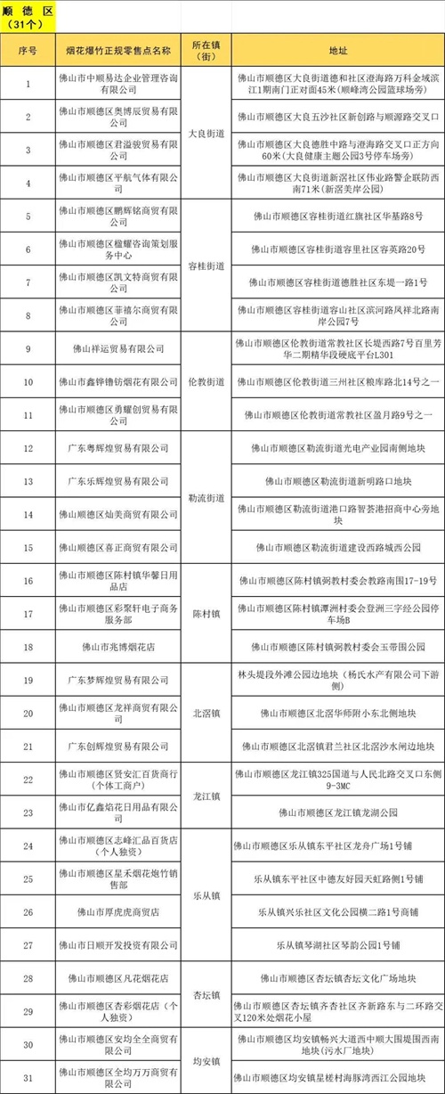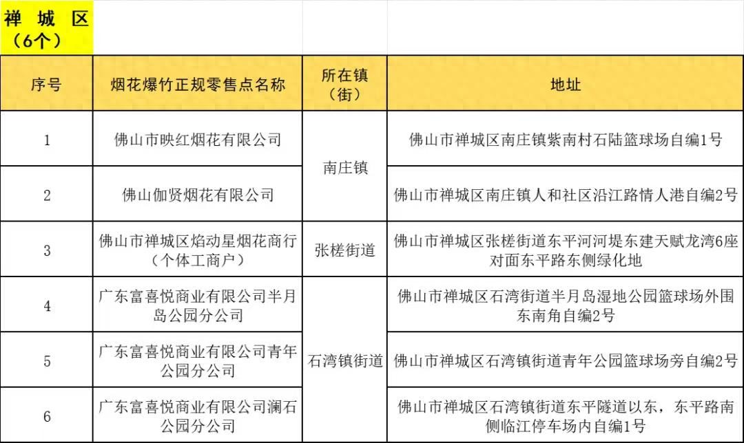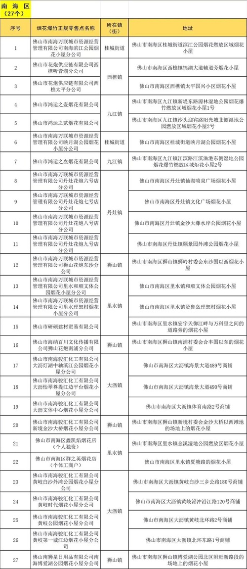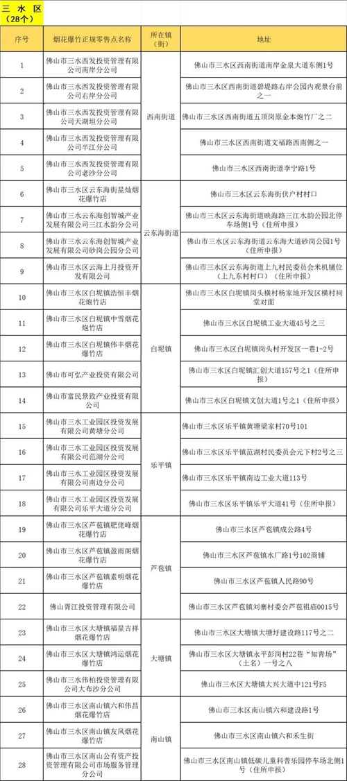 截至26日,佛山五区101个烟花爆竹正规合法零售点中,其中禅城区6个、南海区27个、顺德区31个、高明区9个、三水区28个,市民可根据佛山市烟花爆竹正规零售店名单及地址,到正规合法的零售店购买烟花爆竹。