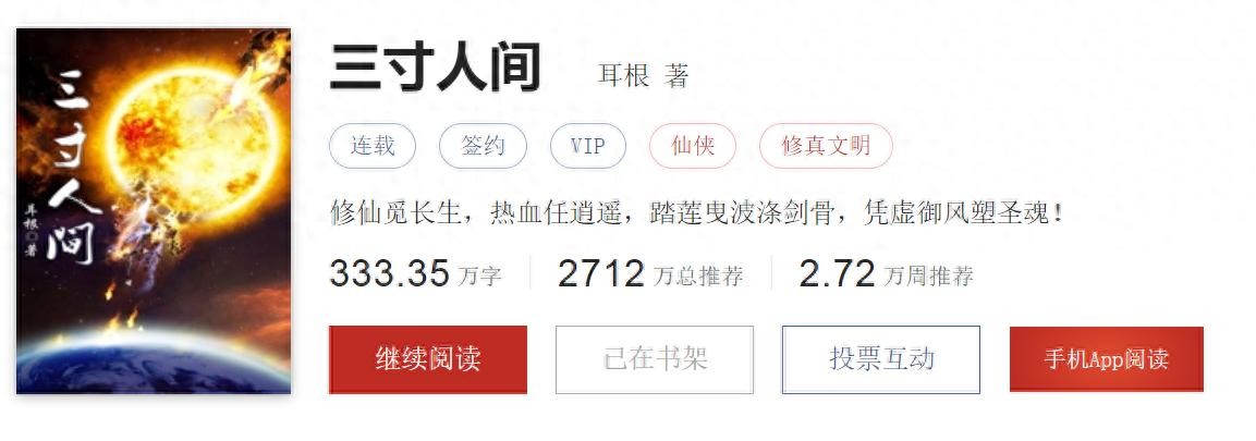 印象中《三寸人间》是两年前看的了,期间耳根因要调整状态有几个月的更新变得零零碎碎,今天想起来一看,《三寸人间》已经333万字了。