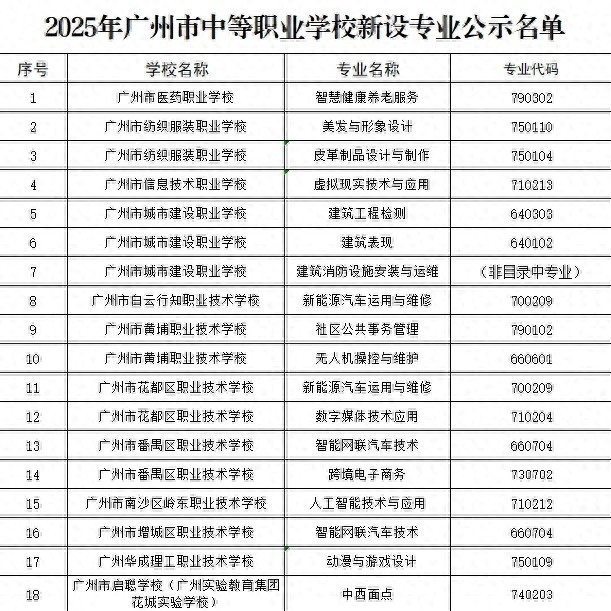 2月21日下午,广州市教育局官网发布了2025年广州市中等职业学校新设专业、示范专业及校企合作项目公示名单,广州市12所中职学校有望今年增加18个新专业,有意向报读的初三考生请留意。