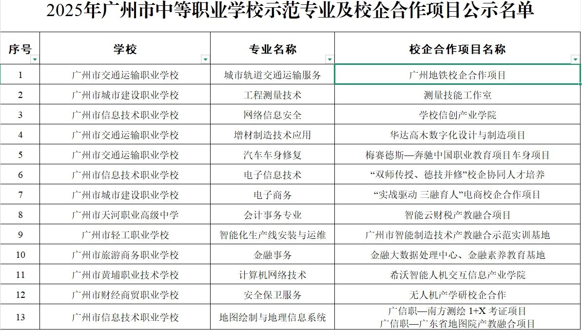 而在公示的13个示范专业及校企合作项目中,也多见数据处理、信息交互、智能制造等领域,涵盖广州地铁、梅赛德斯—奔驰、希沃等知名企业。