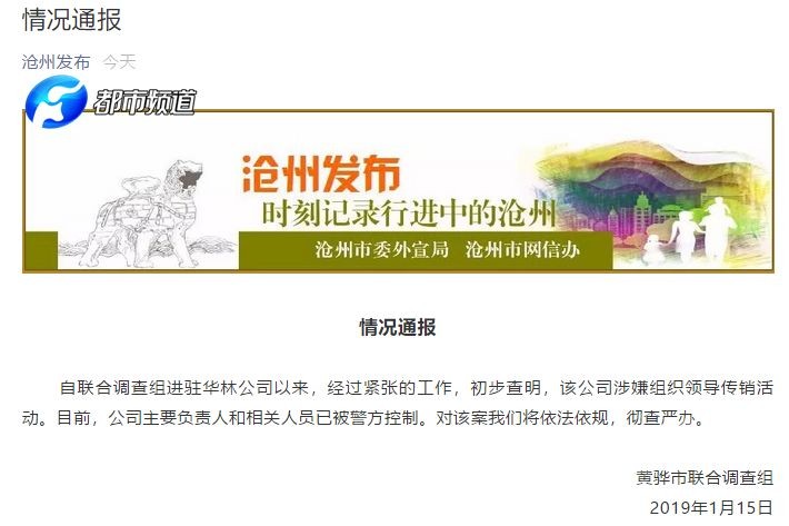 自联合调查组进驻华林公司以来,经过紧张的工作,初步查明,该公司涉嫌组织领导传销活动。目前,公司主要负责人和相关人员已被警方控制。对该案我们将依法依规,彻查严办。