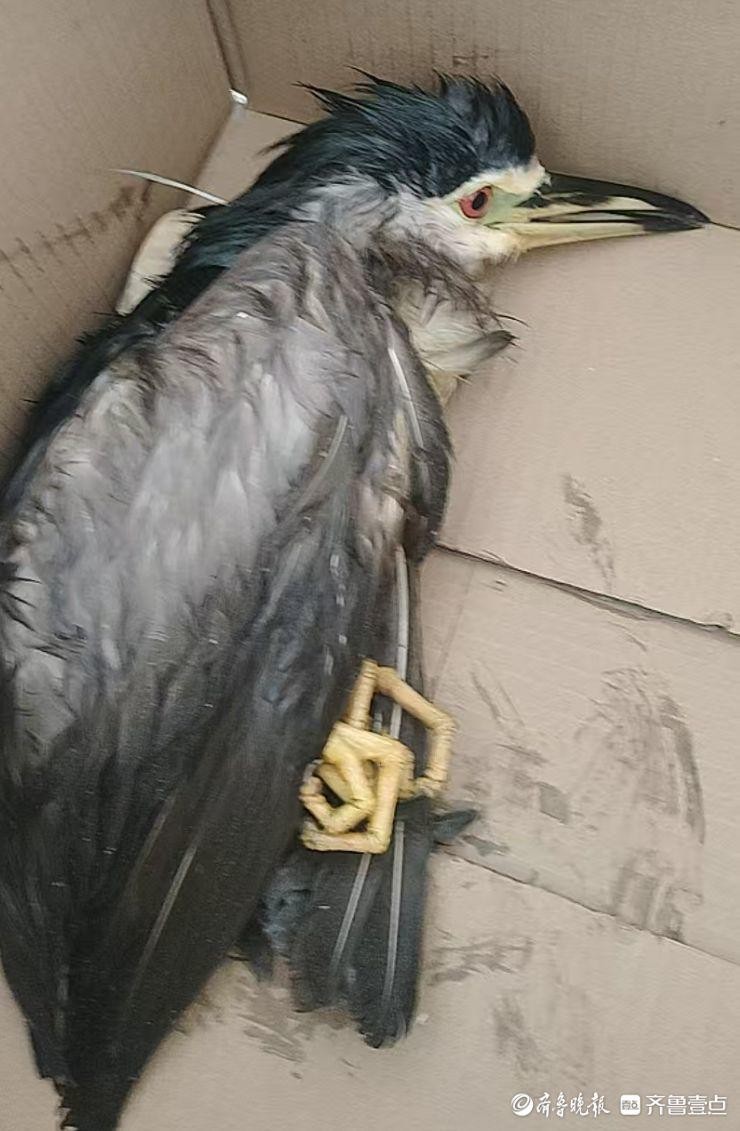 国家二级保护动物夜鹭翅膀受伤落地,城阳警民暖心救助