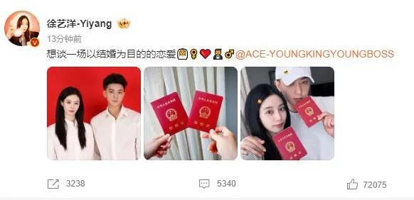 徐艺洋发表微博称:“想谈一场以结婚为目的的恋爱”,黄子韬甜蜜回应:“目标已达成”。两人晒出结婚证照片。7月14日,二人晒出海边亲吻照官宣恋情。
