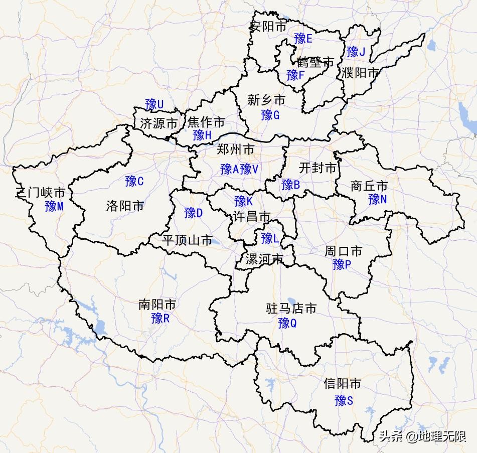 河南省简称“豫”,管辖17个地级市,1个省直辖县级市。车牌号第一个字母从豫A排到豫V,分别是: