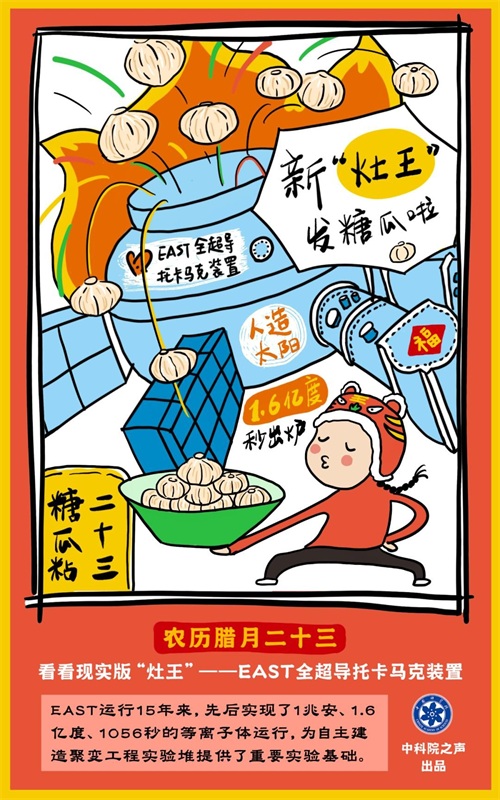 腊月二十三很多地方有着吃糖瓜祭灶王爷的习俗。现实版“灶王”——EAST全超导托卡马克装置运行15年来,先后实现了1兆安、1.6亿度、1056秒的等离子体运行,为自主建造聚变工程实验堆提供了重要实验基础。