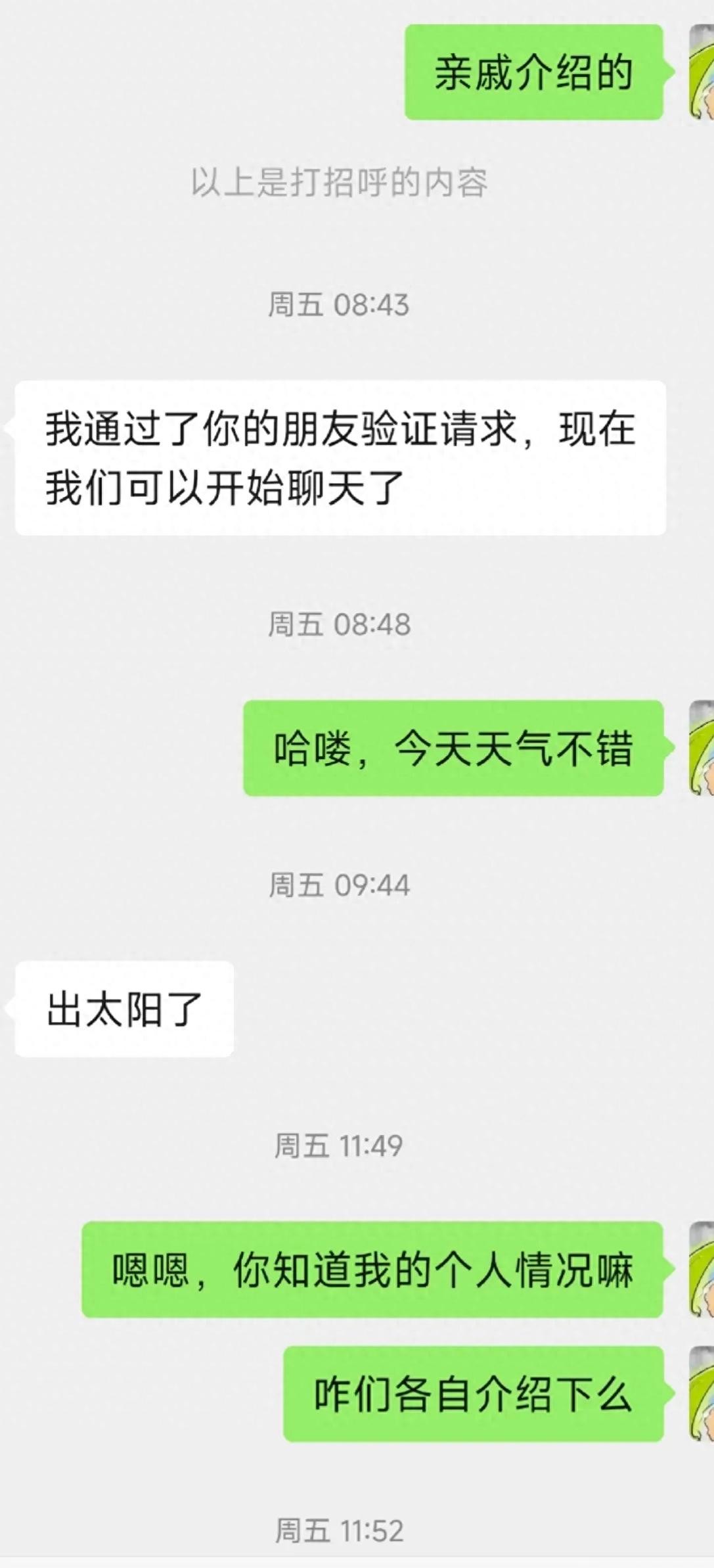 上周五,亲戚给我介绍了个女生,先是通过介绍人互相传看了照片,才加的VX。