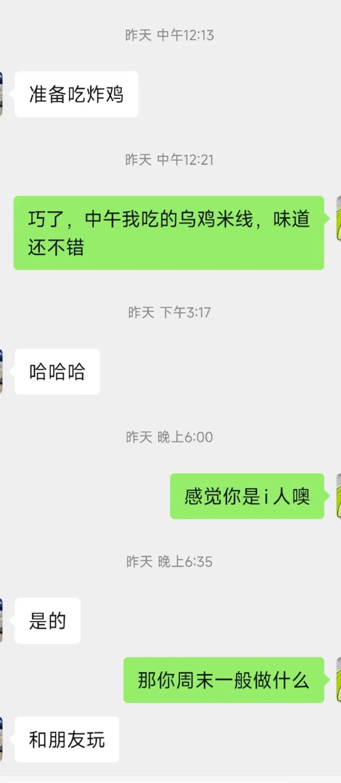 聊了三天,这三天里,都是我主动挑起话题,发的信息,她也总是很久才回复,而且回复的内容也是简短得让人无法接茬。我性格内向,本就不擅长聊天,碰到她这种惜字如金的女生,更是手足无措。不想再继续内耗,于是说了不合适。