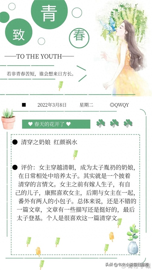 评价:女主穿越清朝,成为太子胤礽的奶娘,在日常相处中培养太子。其实就是一个披着清穿的言情文。女主之前有嫁人生子,有自己的儿子,康熙喜欢女主,后期与女主在一起,番外有两人的小包子。总体来说,还是不错的一篇文章,文章有一些描写还是挺好的,最后太子登基。个人是很喜欢这一篇清穿文。#你看过的最好看的小说叫什么##清穿#