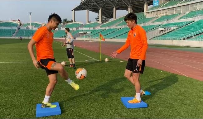 齐鲁网·闪电新闻1月15日讯 今天下午,正在广州冬训的山东鲁能迎来了第二场热身赛,对手是中甲球队内蒙古呼和浩特中优。半场休息时,王彤、陈科睿在场边热身,二人站在泡沫板上玩起了传球游戏,流畅的传接,引起极度舒适。