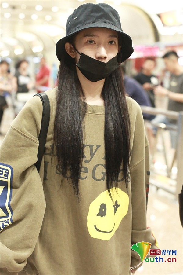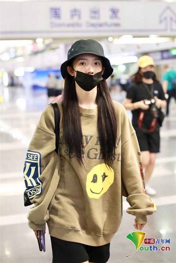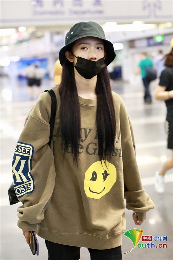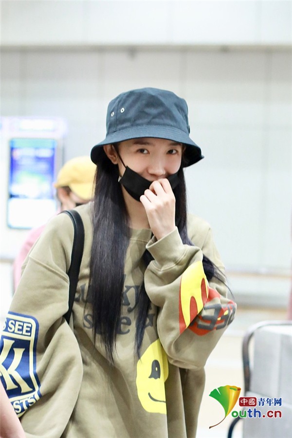 2019年5月30日,北京,孟美岐现身机场。深夜素颜回京的她戴着帽子口罩包裹严实,见到有粉丝跟拍后露依旧浅笑,努力营业。