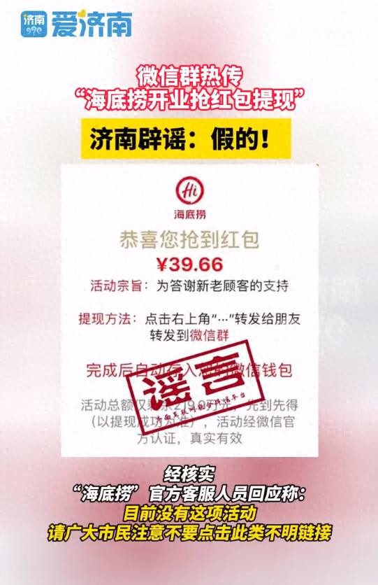 微信热传“海底捞开业抢红包提现”?济南官方辟谣:假的!