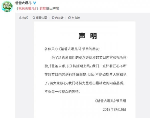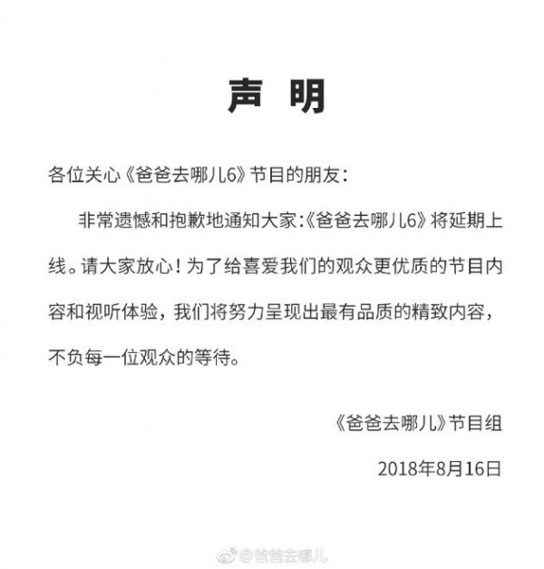 16日中午,《爸爸去哪儿》官博发布声明,称《爸爸去哪儿6》将延期上线,具体播出日期声明中并未提及。