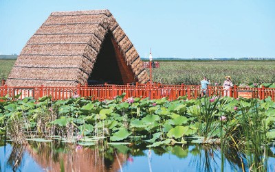 查干湖位于吉林省松原市前郭尔罗斯蒙古族自治县境内,是我国十大淡水湖之一。近年来,当地政府实施多个生态修复治理类项目,通过上控源、下截污、外引水、内修复等措施,持续修复生态、提升水质,还林、还湿、还草面积逐年扩大,珍稀鸟类种群逐年增多。图为8月26日,游客在查干湖参观游览。