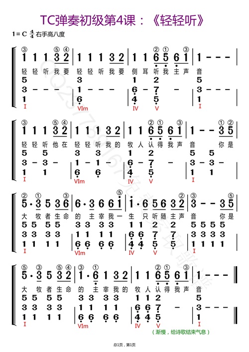 TC4.2「司琴教学免费」弹奏初级第4课歌谱《轻轻听》