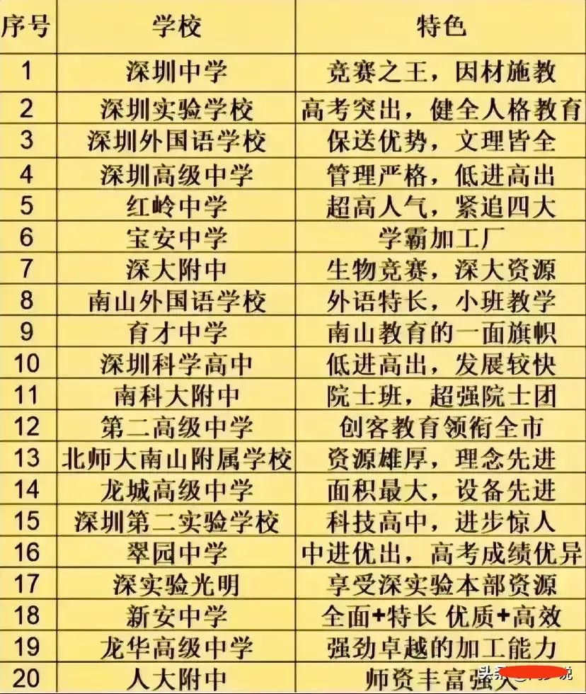 深圳高中前二十名特色各自有所侧重,如果有特长的学生也可以根据自己的专长来选择学校。整体上四大在前列,地位还是很高的,而十大也是在深圳有排名的。加油!