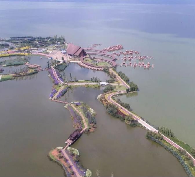 古滇湿地公园占地1100余亩,是在原有的200亩自然湿地基础上改造扩建成的生态湿地,还打造了5.6公里的环滇慢行步道,由“昆明湖”、“牵星海”、“采莲塘”三大主题区域构成,以古滇文化为核心,融入了“汉武开滇”、“郑和下西洋”及“陈圆圆”等历史故事,具有很高的文化口味和内涵,与滇池水体共同构建出一道生态修复、水体净化的隔离屏障。