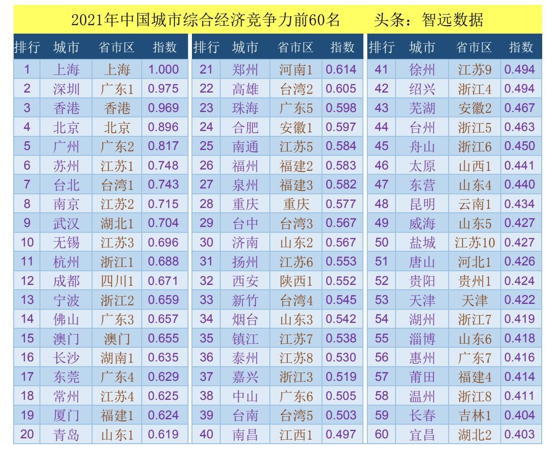 2021年中国城市综合经济竞争力前60名