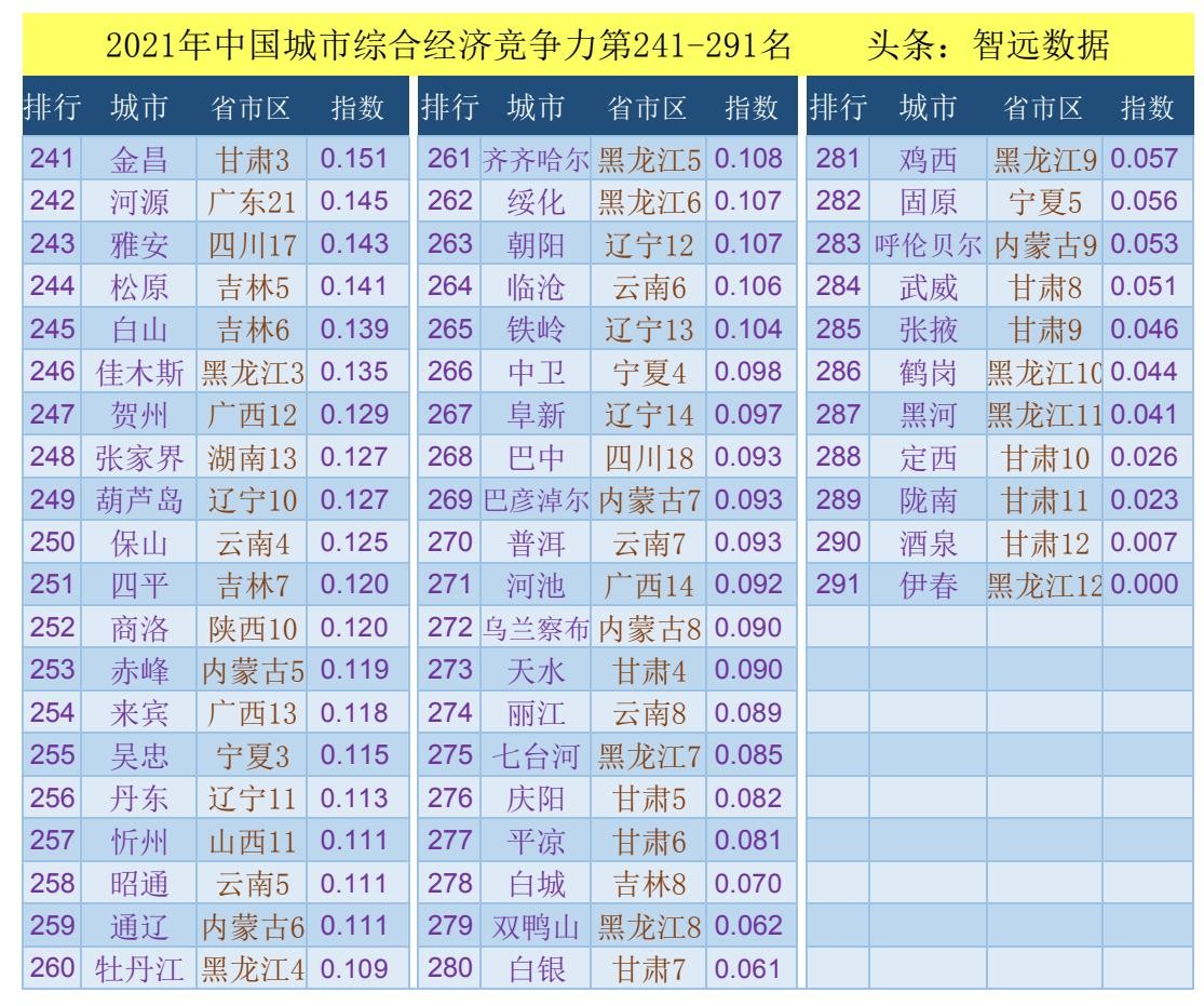 2021年中国城市综合经济竞争力第241-291名