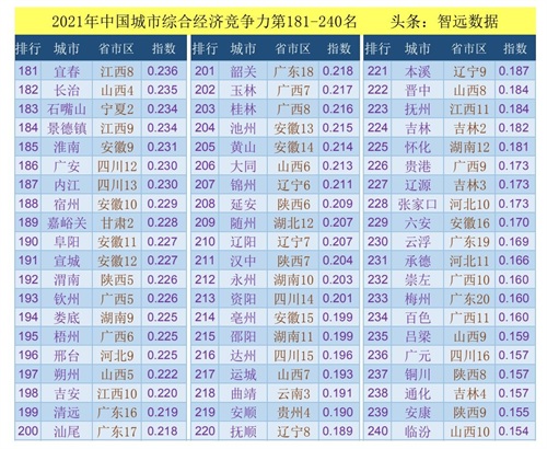 2021年中国城市综合经济竞争力第181-240名