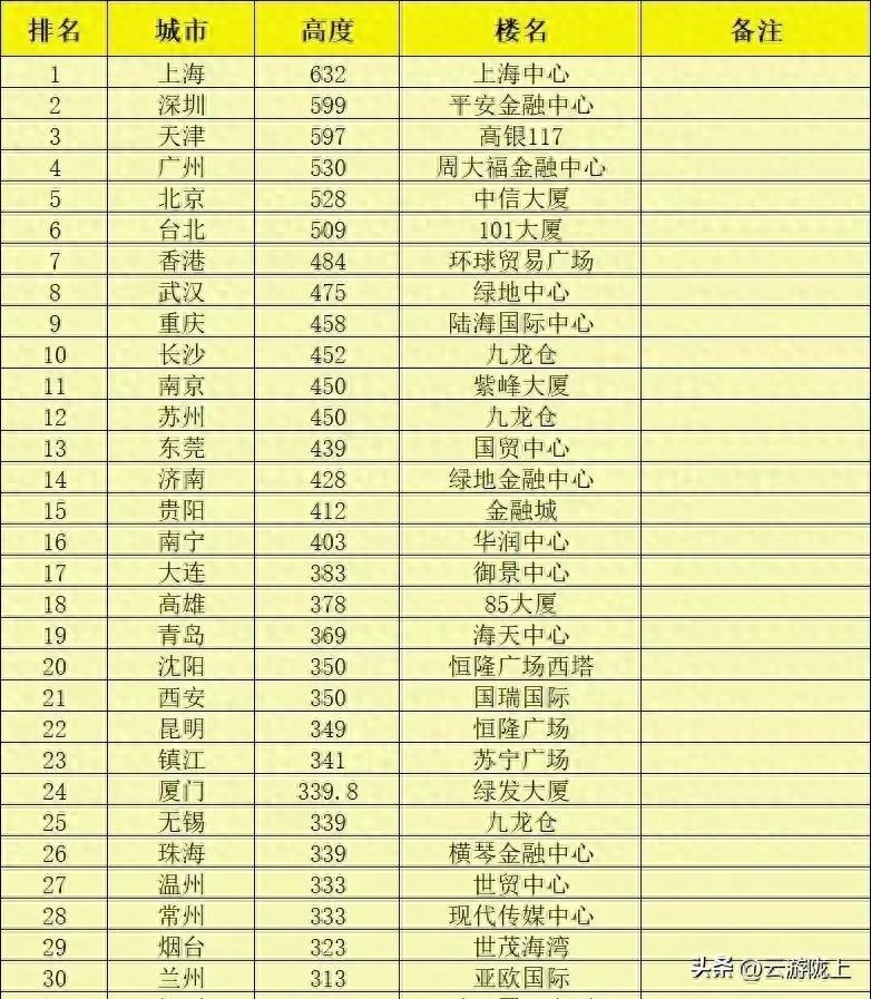 #头条文章发文任务#一个城市天际线(地标建筑)的高度在一定程度上反映该城市的发展水平,全国主要城市已建成最高建筑高度排名中,上海、深圳、天津、广州和北京居前五。