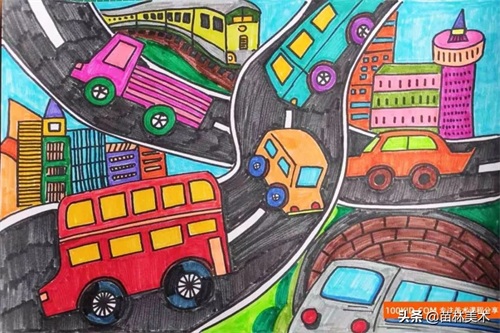 「儿童创意画」站在城市街头,恍如置身车水马龙的大城市