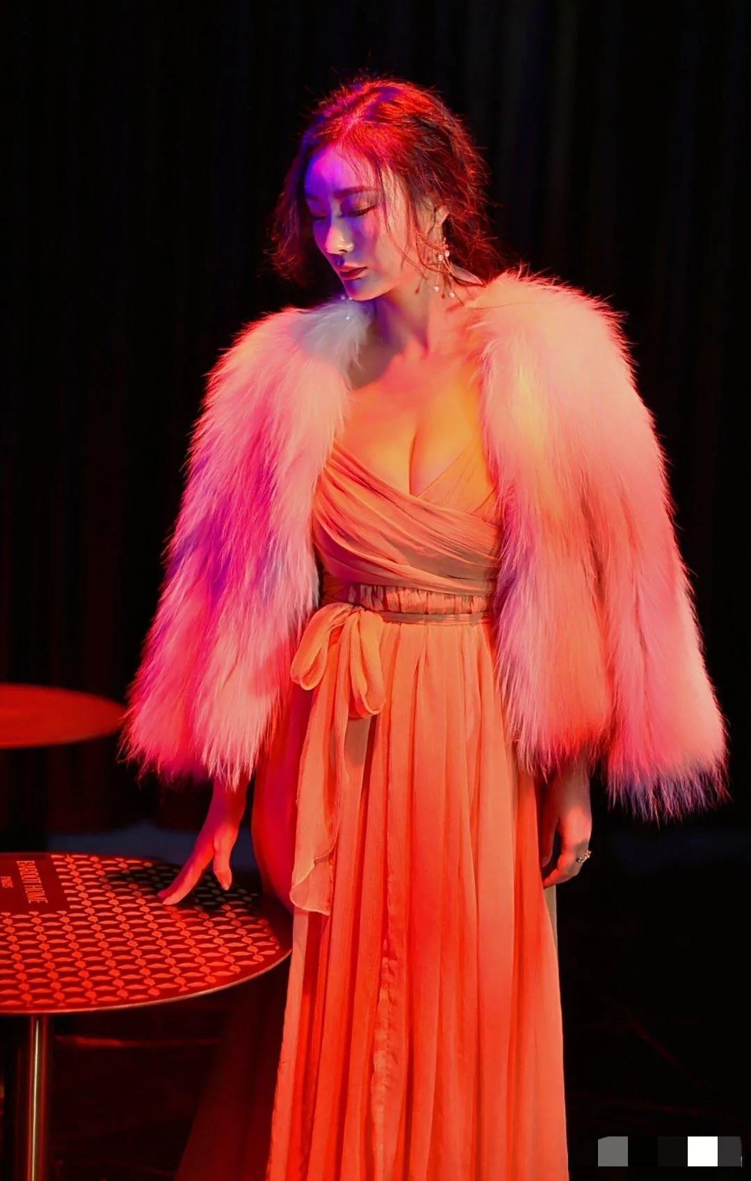 王李丹妮身披蓬松白狐毛披肩,一袭深V粉裙勾勒出傲人曲线