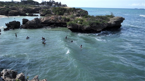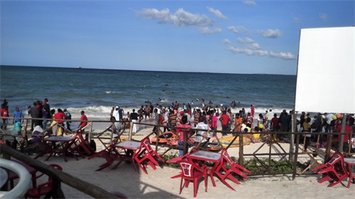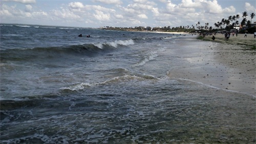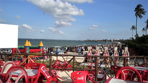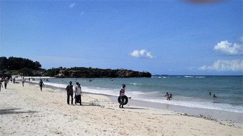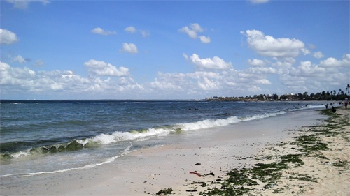达累斯萨拉姆作为一个海滨城市,也是一座旅游城市,按理来说它的海滩应该是很漂亮的。结果在我闲暇的时候跑去看了下才发现他们的海滩上有好多的海草,像一条黑色的带子歪歪扭扭地铺在沙滩上,中间还夹杂了不少的垃圾,海水里也有好多的碎海草,随着海水在沙滩上窜来窜去。我刚去的时候就有不少的人,过了一会儿突然来了更多的人,沙滩上都快站满了,感觉和国内一样在“下饺子”,这和肯尼亚的蒙巴萨和马林迪海滩形成了鲜明的对比,后两处沙滩要干净很多,平时人却很少。不知道是不是因为达市正好是坦桑尼亚首都,所以常住人口比较多,来海滩玩的也就比较多,人多了也就难免会把海滩弄得脏一些吧。另外,感觉他们的海滩上只能游泳,没有看见马和骆驼,想在沙滩上骑行估计是不行了。人少的时候我还可以在沙滩上散散步,看看远处蓝蓝的大海和晴空,让海水帮我洗洗脚。后来人多了,我不想和他们挤在一起,于是就跑到旁边的酒吧坐了下来。我点了一瓶冰镇的饮料,买了一个包着盐的水煮蛋,一边喝着,一边吃着;一边吹着凉爽的海风,一边看着人头攒动的海滩和远方的大海。看了一会儿就觉得很无趣,赶紧喝完饮料就回酒店了,没有一点想多待一会儿的冲动。
