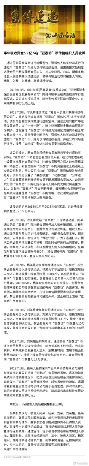 半年吸收资金5.7亿 5名“亚泰坊”币传销组织人员被诉