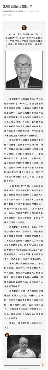 据中国中医科学院眼科医院:7月28日凌晨3点22分,首届国医大师、中国中医科学院名誉院长、中国中医科学院眼科医院名誉院长唐由之同志在北京逝世,享年97岁。