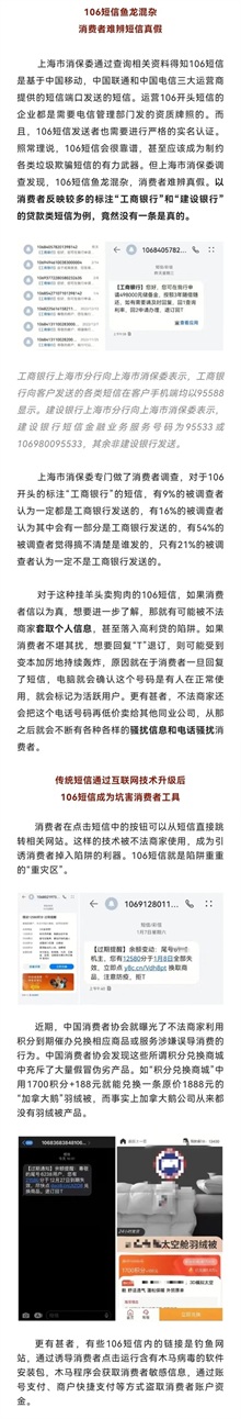 多年来,垃圾短信一直让消费者不堪其扰,其中106短信平台已经成为垃圾短信的最大发送源头。据上海市消保委调查,76%的消费者表示经常收到“106”开头的垃圾短信。上海市消保委关注到,传统短信通过互联网技术升级后,106短信已经成为坑害消费者的工具。