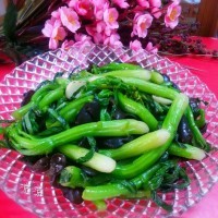 3.锅烧很热油,下锅油菜大火翻炒,同时顺着锅边,温开水滴些到油菜里不断翻炒(炒蔬菜时要用温开水,这样炒出的菜才够鲜艳)将木耳下锅,铺油菜面上盖盖煮2分钟左右,打开盖调入盐,鸡精,再淋上花生油,拌均匀关火出锅。